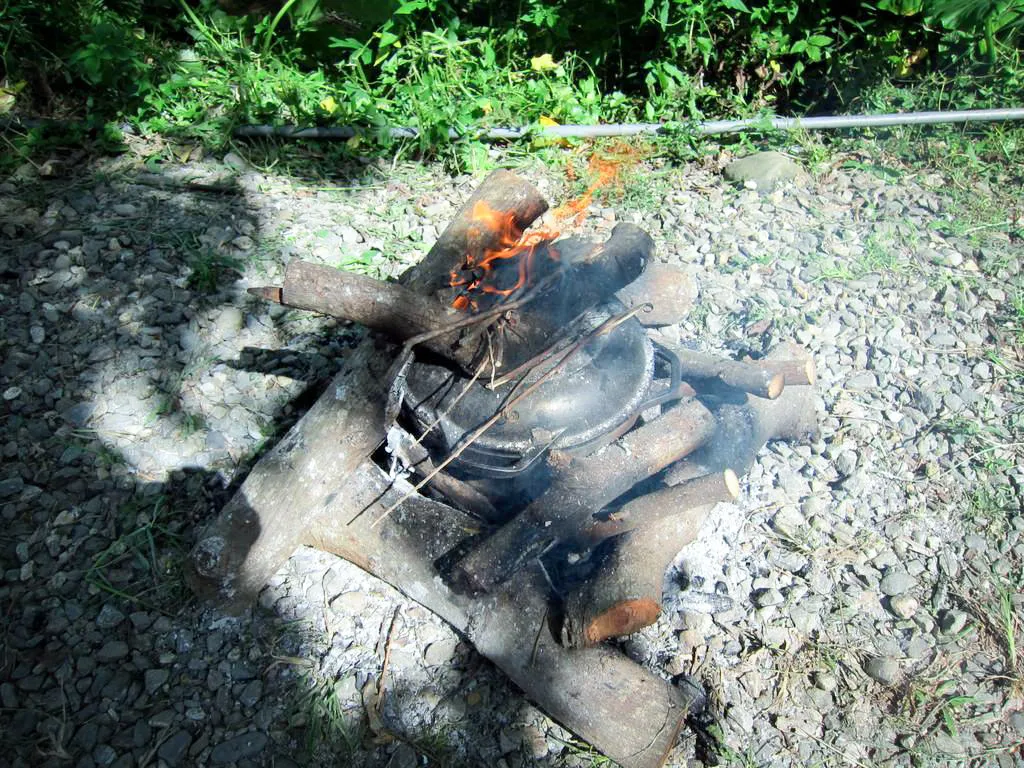 「幾乎每回都有溪魚可吃。抓到魚之後,清除內臟。取溪畔的枯木生火,炙烤,待顏色焦黃後,撥開魚皮灑上鹽,新鮮的溪魚都好吃,只是多刺,魚肉香甜細軟,恨不得大口咬下,卻只能細細地用舌尖揉碎品嚐,一邊吃肉一邊挑刺。我最喜歡別名一枝花的台灣馬口魚,肉質肥美。……其實最適合打魚的時間點是晚上,晚上的魚比較不活躍,這是前晚抓的。柏宏做了日式蕎麥麵,主食是酥炸一枝花,配上冰啤酒,完美的夏日午餐。」