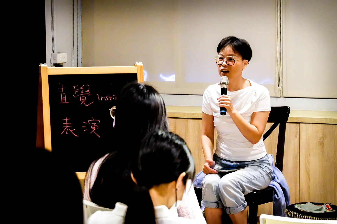 黃舒湄於戲劇課和學生分享表演,之所以說不出『熱愛表演』這樣的話,很有可能對這個狀態,愛到沒有知覺。攝影: 陳文偉
