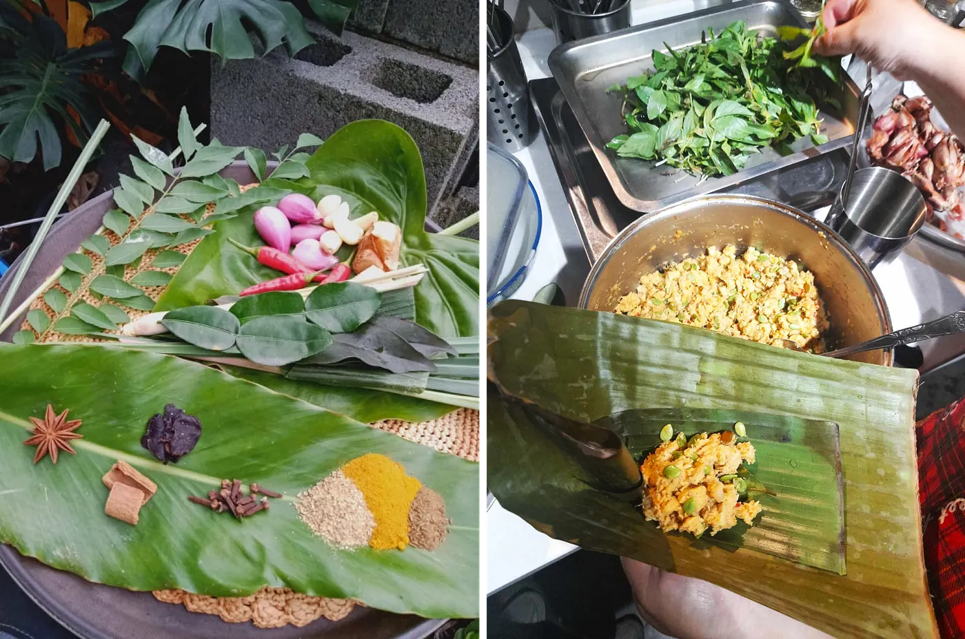 到了中秋,IBU廚房推出來自印尼東爪哇的「蝦醬香辣烤雞腿(Ayam Bakar Bumbu Rujak)」:「我們用辣椒、檸檬葉、蔥末、蒜末、香茅、南薑、椰糖、羅望子和蝦醬去做香料醬,塗在雞腿送烤。」還有「蕉葉天貝(Botok tempe )」,用香蕉葉包裹主角椰子絲蒸熟,「傳統的作法是香蕉葉包椰子絲、小魚乾、鹹蛋、天貝、蔬菜,味道很香辣,以前農夫務農都會帶這個配白飯,在田裡解決一餐;我調整辣度,特別加了月桂葉和九層塔來增加香氣,還有放進台灣常見的銀合歡(patai cina)。」最後佐以少許蔥、蒜、辣椒、山柰、糖和鹽巴調和,成了Yeni家常版蕉葉天貝。