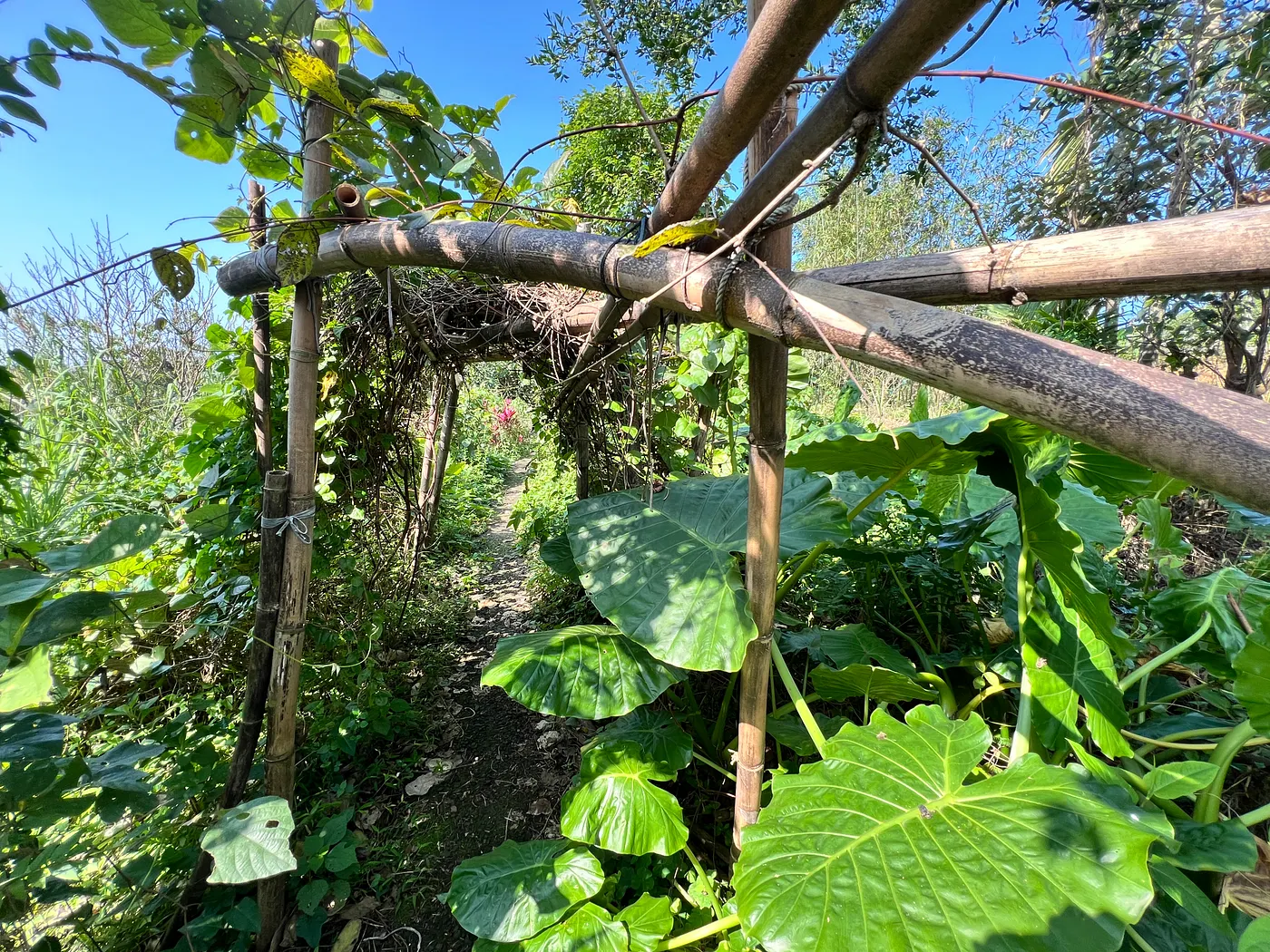 穿過蔓生的植物,走過泥土小徑與石階,才會抵達大屯山腳下的幸福農莊。攝影:陳幸伶