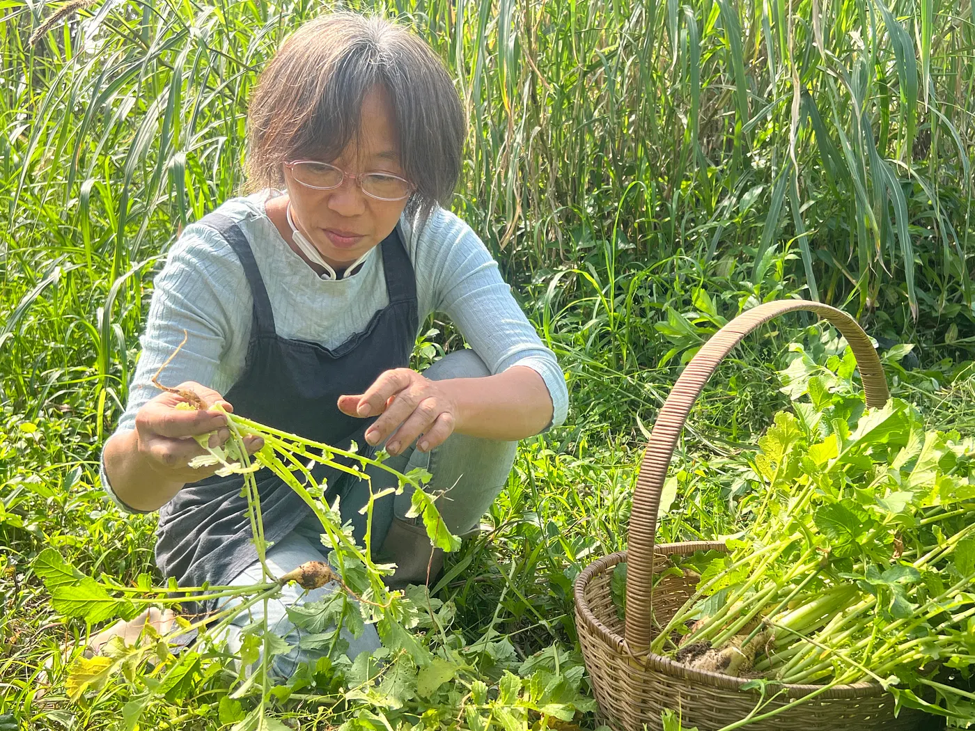 在田裡一邊解釋著,陳惠雯一邊示範如何挑選比較肥美的紅、白蘿蔔、大頭菜與老熟的豌豆莢,作為隔年留種種植用。今日午餐,只取用留種作物旁長得太密集的紅、白小蘿蔔與碗豆莢,如果有擋住作物太多陽光的雜草,才拔除、放置一旁。