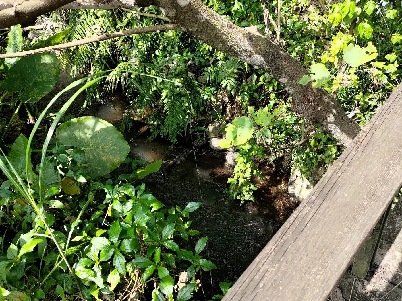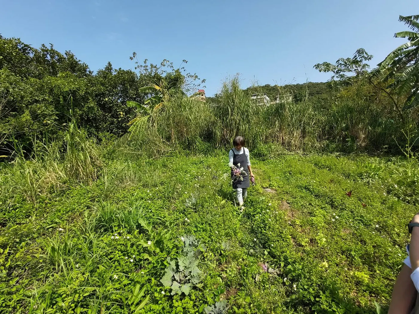 走下兩旁蔓生著姑婆芋與蕨類的石階小路,跨過小溪圳上的木橋,眼前展開的是一大片非典型的農場與菜園景象。因為順應自然,不施肥(包含有機肥)、不灑農藥,沒有太多人為干擾,所以陳惠雯提到很多第一次看見幸福農莊農地的人,常會取笑這是一座雜草比作物多的園子,而且會問道:「不施肥,不灑農藥,種得出東西嗎?」