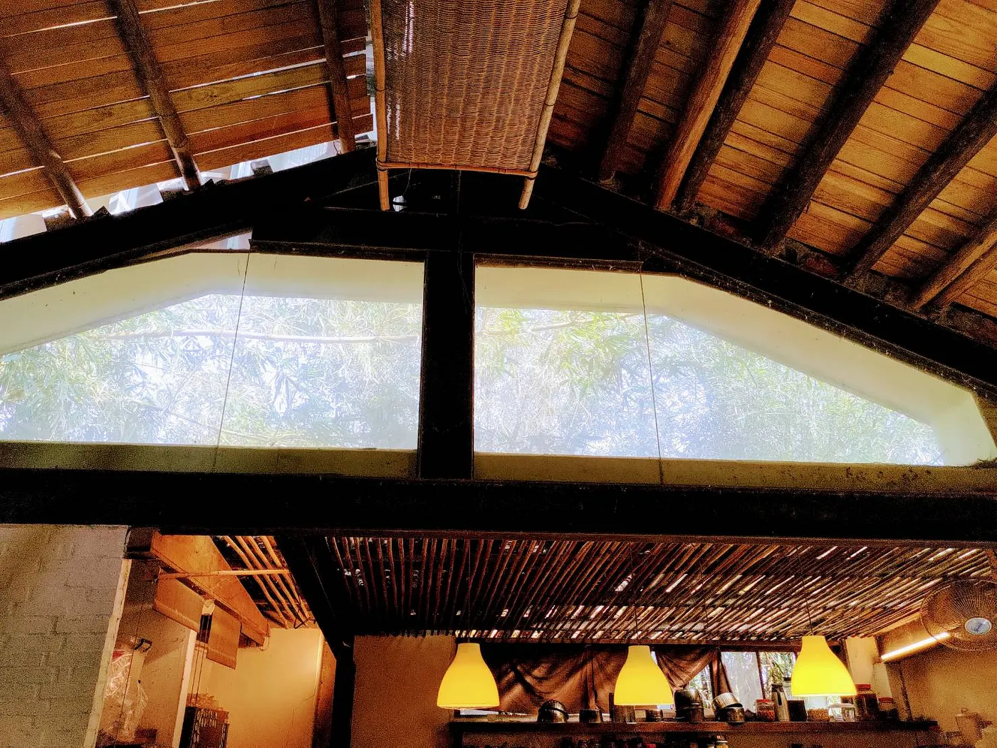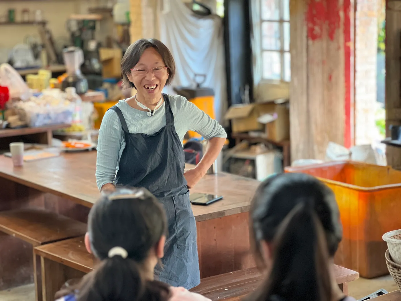 最後,陳惠雯選擇在屋側裝上大片玻璃,讓屋內白天有自然光灑落,除了透過屋旁的大樹樹蔭降溫,又找到專家學習「空氣對流工法」,在鐵皮屋頂較高的地方做了排風窗口。「當室內人多時,熱空氣會自動上浮,從排風口排出,在低處的門口冷空氣會進來補位,空氣就會產生類似強制對流的效果,就算是夏天,也只需開著電扇就很涼爽舒適。」