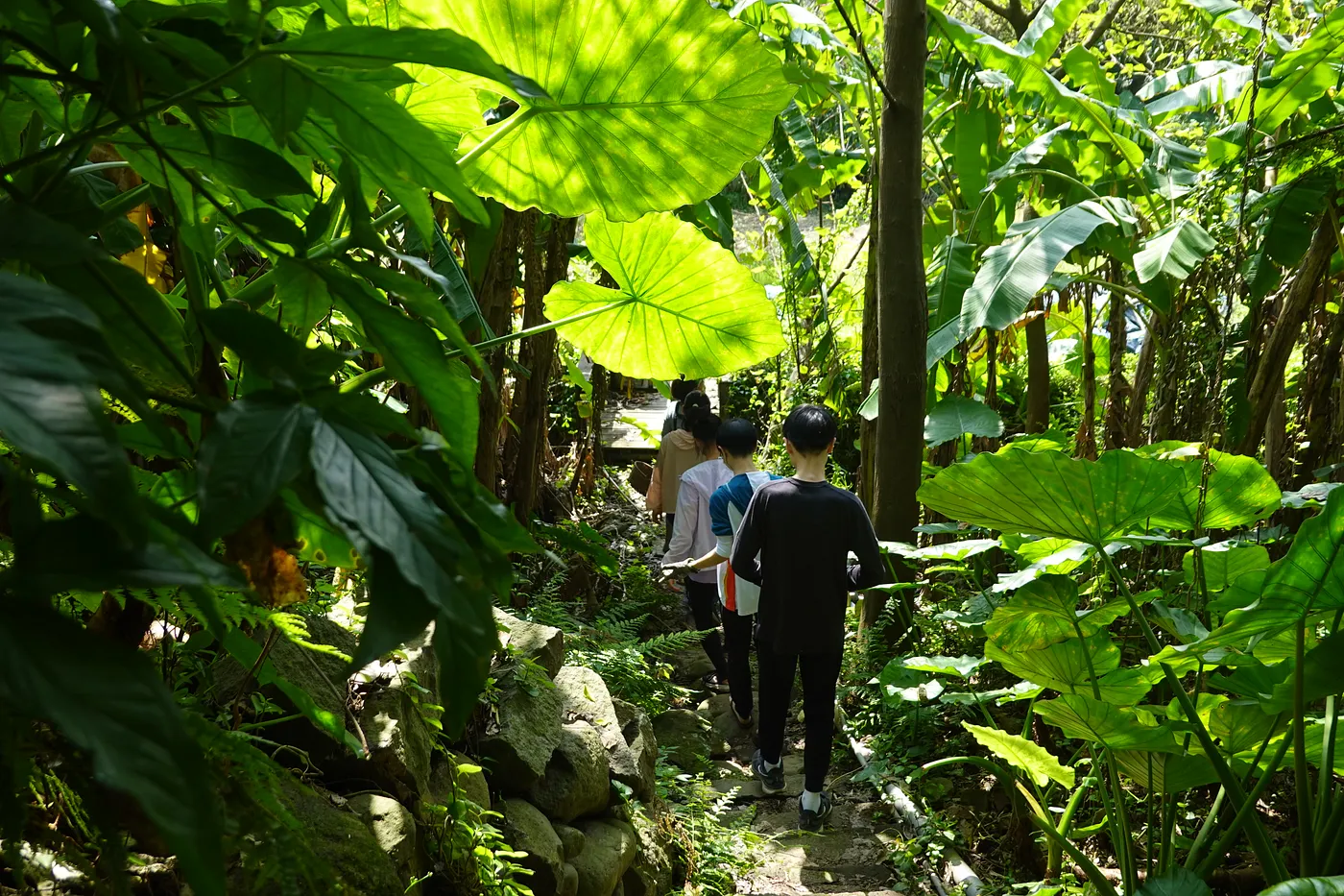 穿過生意盎然的石階小徑,陳惠雯帶著實習的孩子們往自然農法蔬菜園走去。攝影:黃飛霖