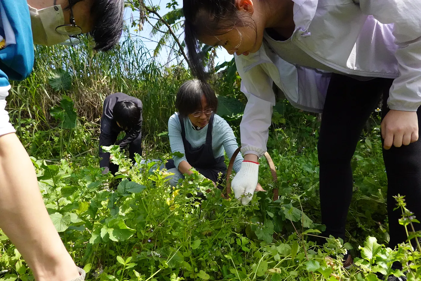 幸福農莊到處是「野著長」的植物,陳惠雯老師正在引導孩子們辨識蘿蔔葉與野草。攝影:黃飛霖