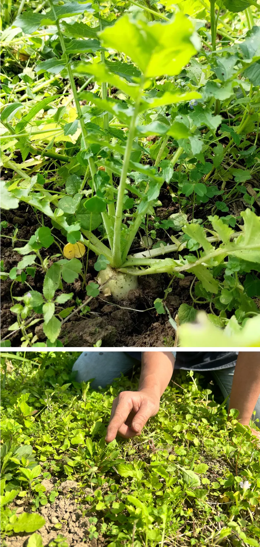 健壯的白蘿蔔與成功復育的澤珍珠菜,都說明了這塊土地有著飽滿的能量。攝影:陳幸伶、黃飛霖