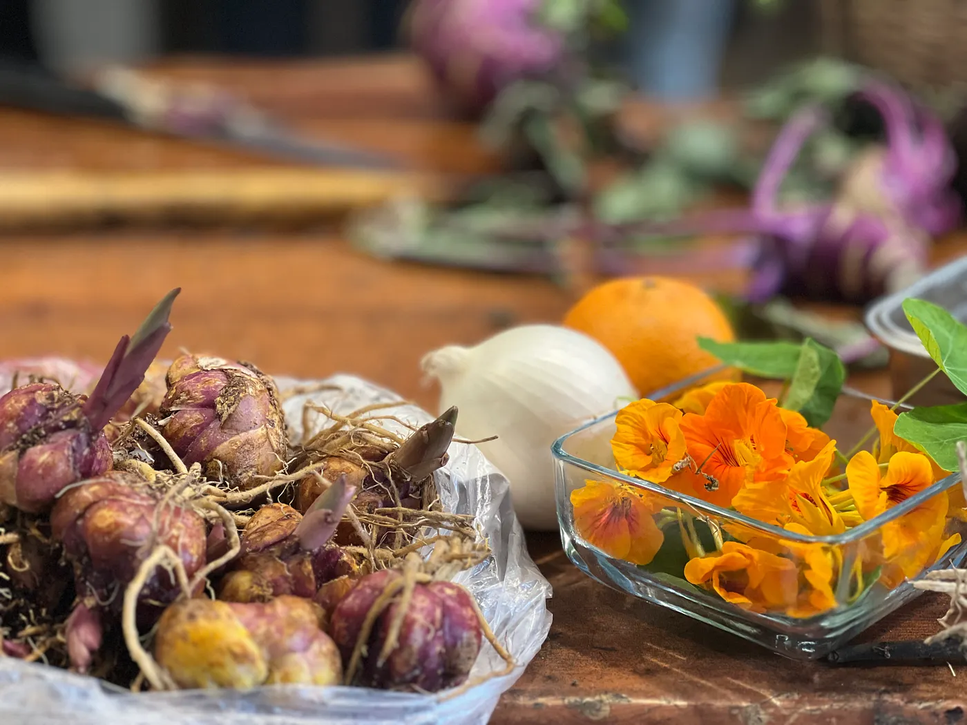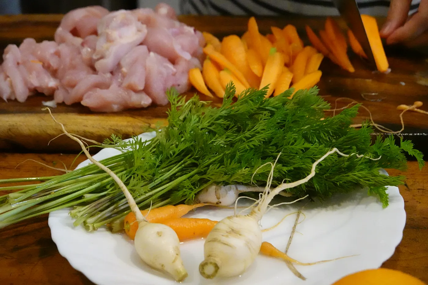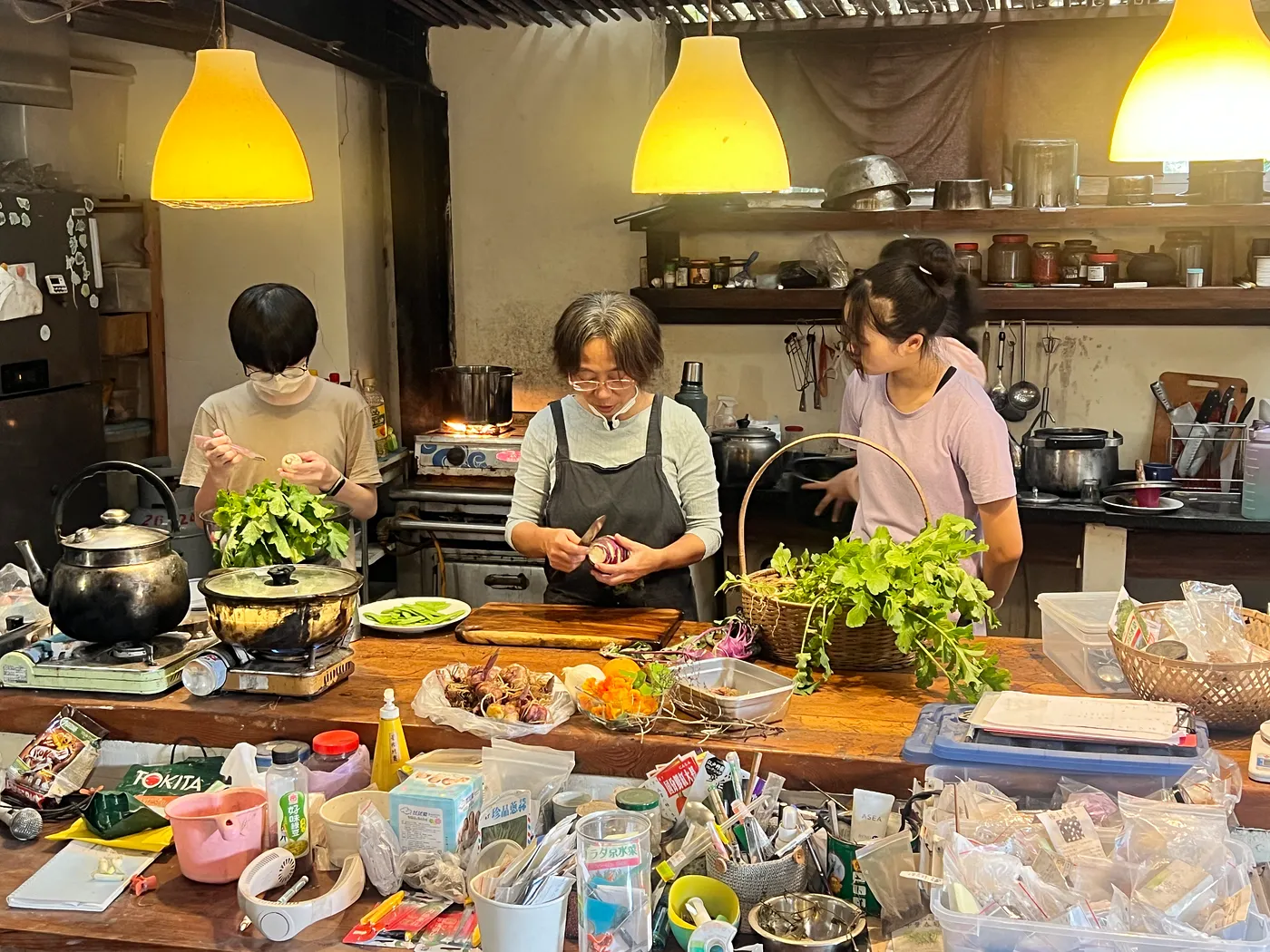 從菜園裡摘採了疏苗的蘿蔔苗、豌豆莢、紅白蘿蔔、大頭菜、萵苣以及一把可食用的金蓮花後,一行人便跟著陳惠雯回到紅磚屋內,開始為今日的自然農法午餐備料。大人們忙著洗、切,學生們幫忙把兩株胡蘿蔔羽葉苗打個結、把蘿蔔削皮、豌豆莢撕去粗纖維。此時正是蘿蔔的季節,所以採收了很多蘿蔔食材,特別挑戰主廚的功力。