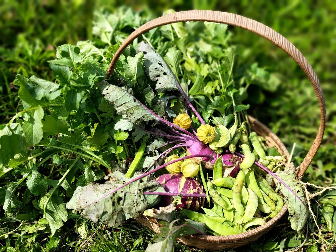 踩在沒有撒除草劑的農地,像走在綠草地毯上,因為地面各種野花草蔓生,保持了土的溼度。菜園裡,黃色的芥菜花正盛開、翠玉般的豌豆莢與橘黃的燈籠果已成熟,撥開靠近地面的各種葉子,還可看見好幾排紅、白蘿蔔與紫皮大頭菜從土中微微露出臉來。這裡還種有葉緣長滿刺的保健植物─奶薊、在歐洲被稱為「蔬菜之皇」的朝鮮薊,以及屬於瀕危植物的台灣葦草蘭……,遠方還有成排的芭蕉樹、金針花叢與金蓮花正跟著風搖頭擺尾。