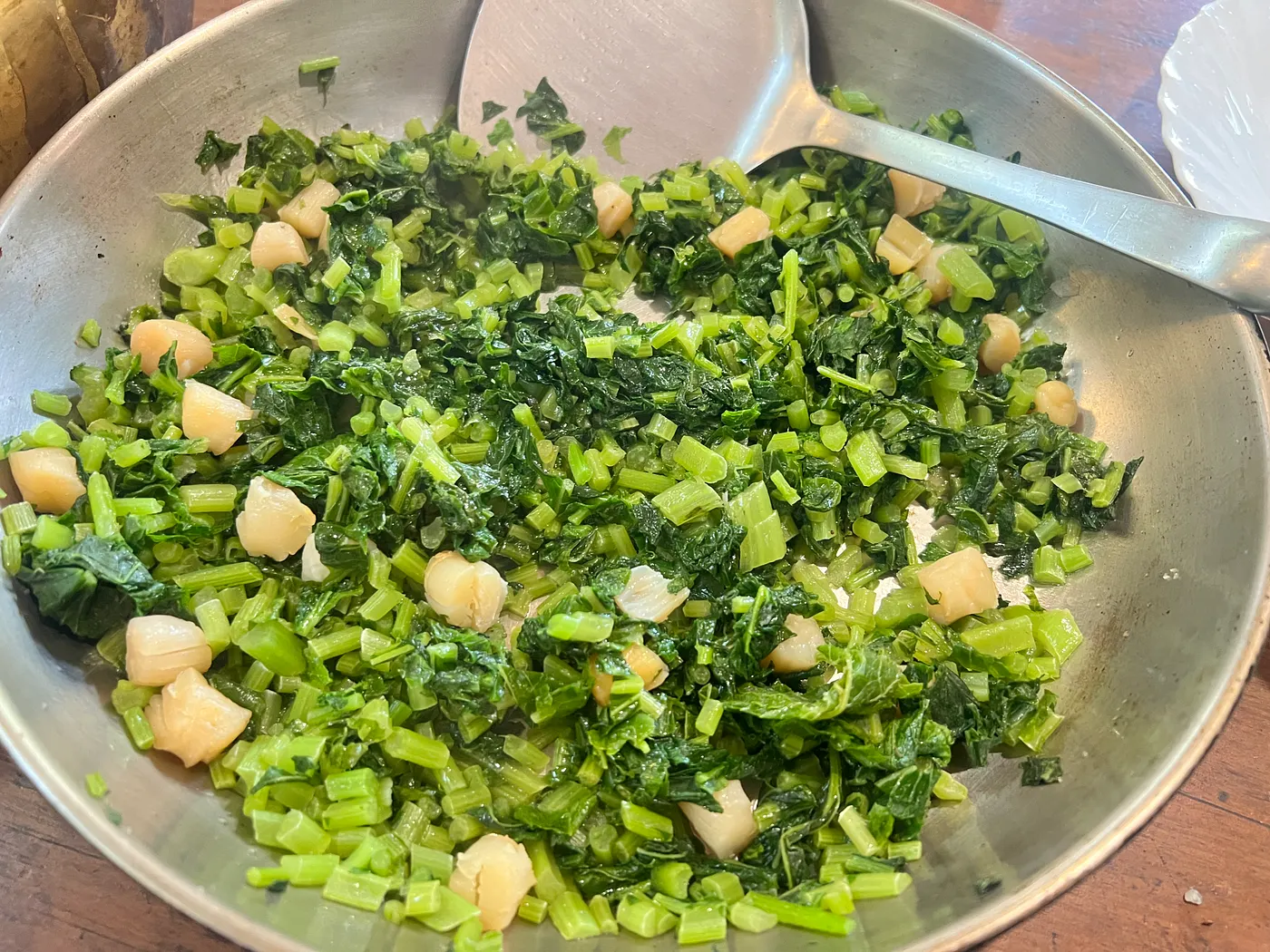 【白蘿蔔莖葉炒小干貝柱】:一把小干貝柱泡熱水,備用。白蘿蔔莖葉切下後、洗淨,整株入滾水中汆燙2分鐘後取出、瀝乾,切成1公分的小段。起油鍋,下白蘿蔔莖葉小段拌炒,加入小干貝柱,少許鹽,拌炒至蘿蔔莖葉變軟。