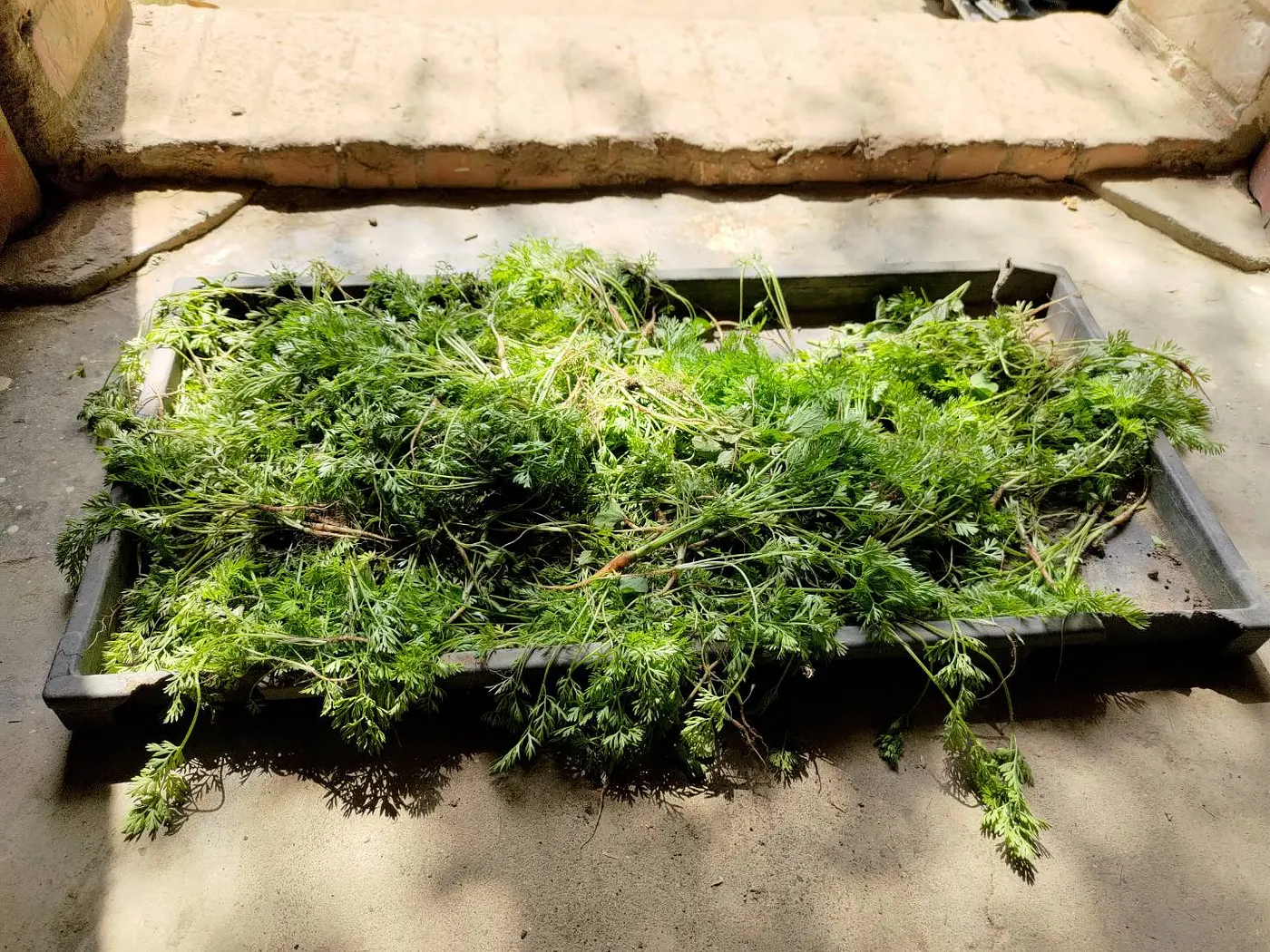 【酥炸胡蘿蔔羽葉苗】:將疏苗後的胡蘿蔔羽葉洗淨、瀝乾水分,灑上少許鹽、糖、麵粉拌勻。取兩株,打個結,待油溫至160度C,下胡蘿蔔羽葉結炸至酥香,即可盛盤。