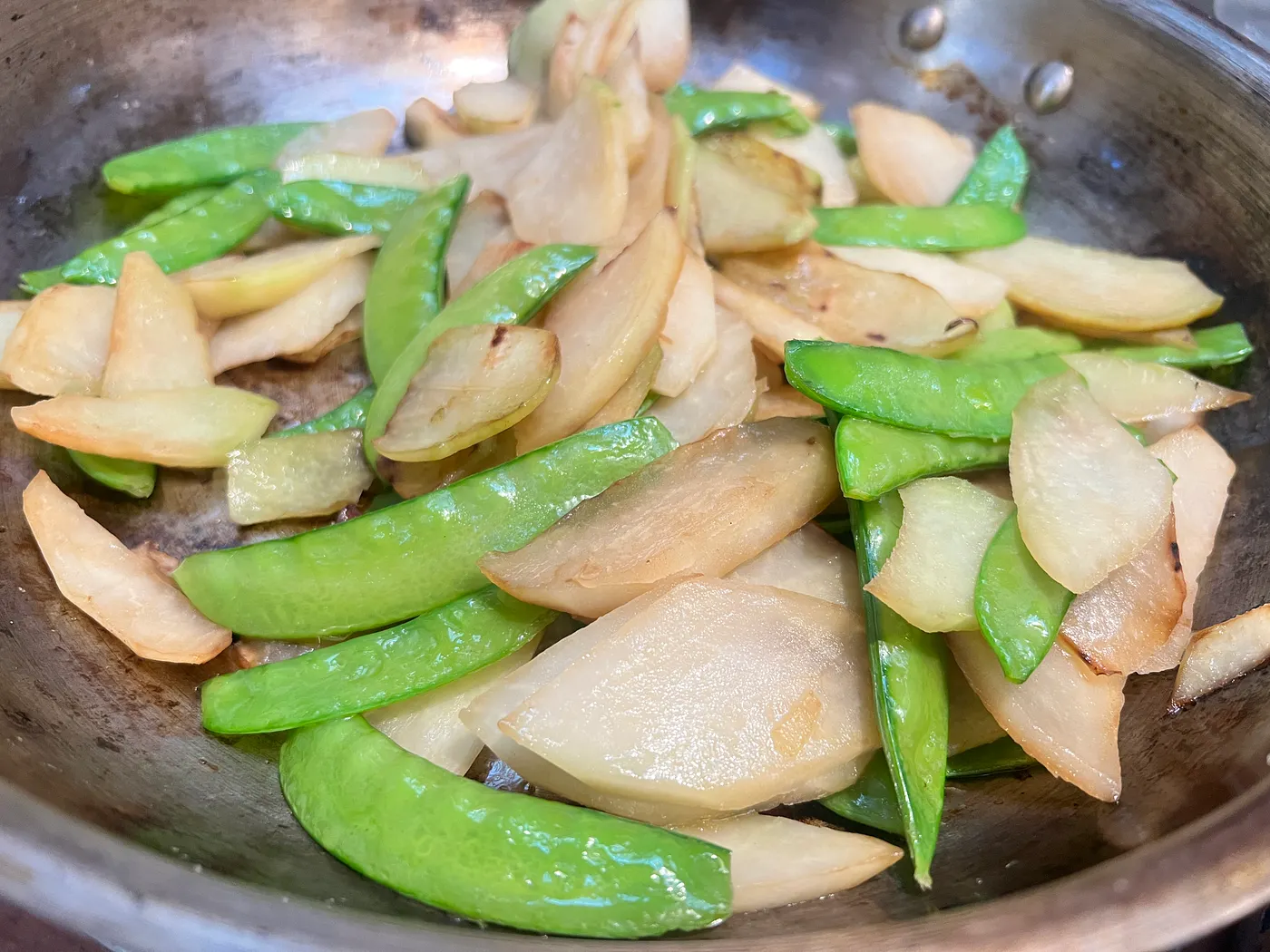 【疊煮大頭菜與豌豆莢】:豌豆莢撕去兩側粗絲;大頭菜去皮、切薄片。將切片的大頭菜入鍋,鋪在鍋底,上面疊上豌豆莢,加入少許鹽調味。放上蓋子後,以小火悶煮,蔬菜本身釋放的水分將讓這道菜更有風味。