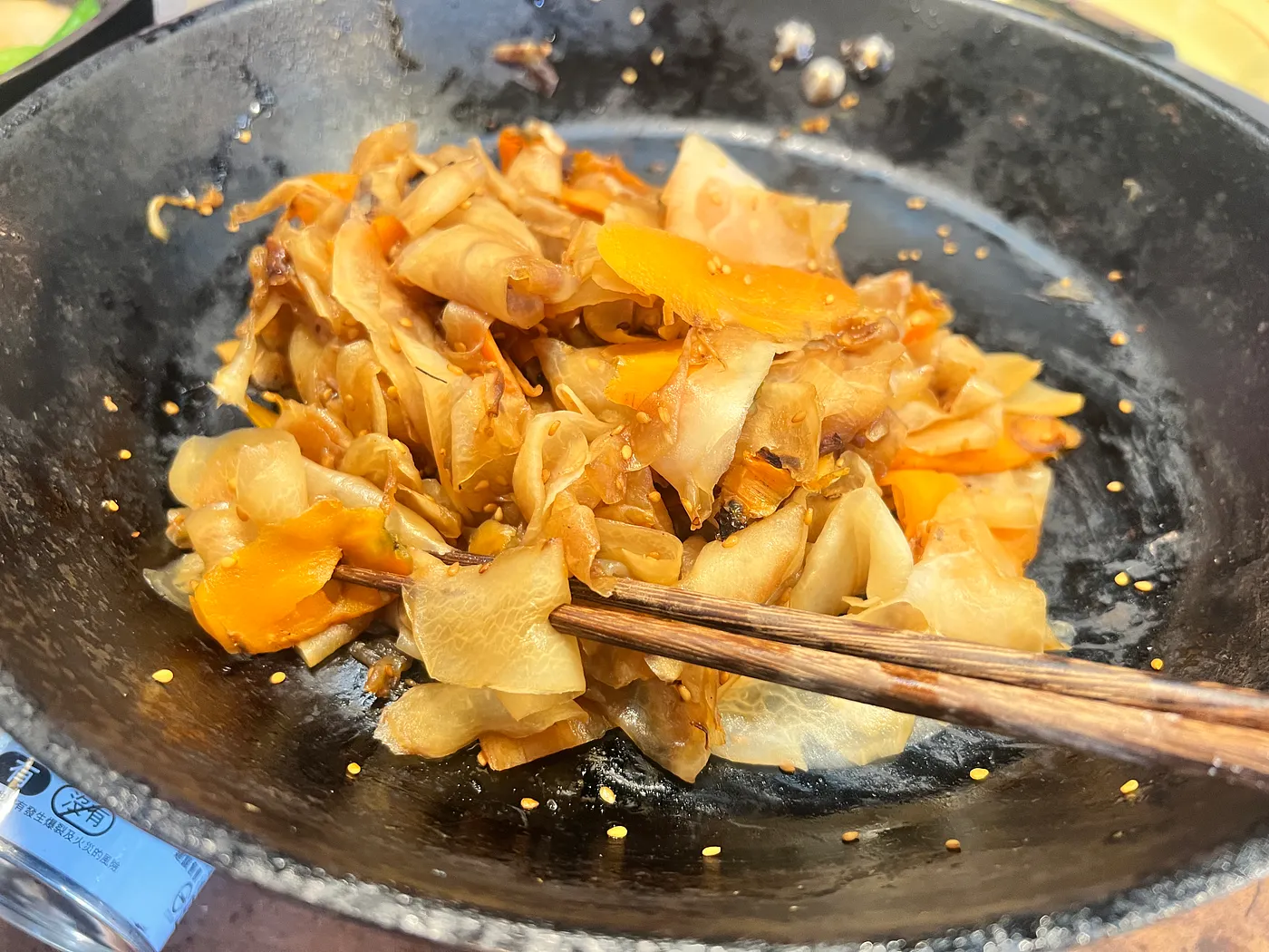 【醬燒雙色蘿蔔片】: 將紅蘿蔔與白蘿蔔以刨刀刨成薄片後,入鍋炒軟,加上醬油調味,起鍋前撒上白芝麻,增添香氣。