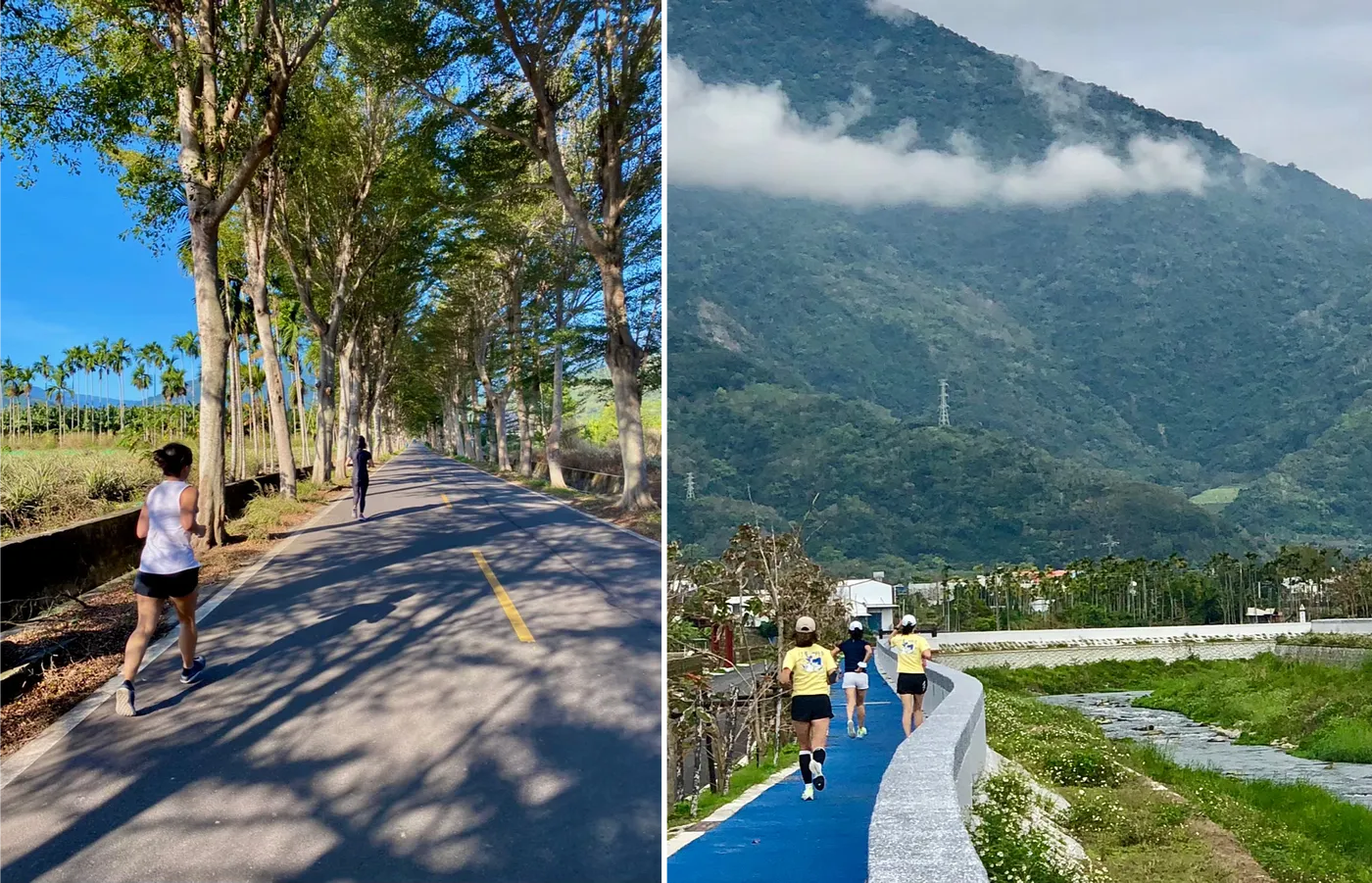 Rachel帶著愛跑步的客人跑過鹿野綠色隧道。疫情期間各地賽事停辦,朋友們仍不願意取消旅行,如期來到鹿野相聚,央求Rachel規劃一段領跑如同賽事的21公里名符其實的跑旅距離。(圖片提供/Rachel)