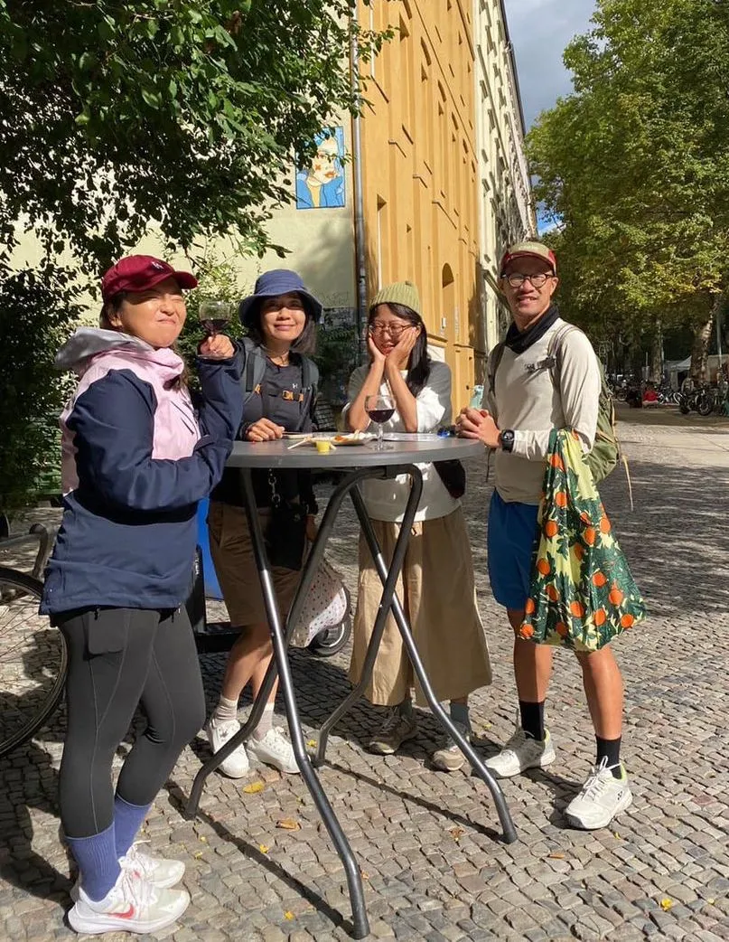 經常往返台灣和德國的Angie,一聽到有「酒」朋自遠方來跑步,鐵定要來場大會合和狂飲,於是她從慕尼黑一路開車開到柏林,一坐下來就拉開後背包,拿出五、六瓶紅酒和從台灣帶來的月餅,她每次出現都是為了朋友,酒沒了立刻到超市補貨、滿滿包包裡都是下酒菜與瓶瓶罐罐。