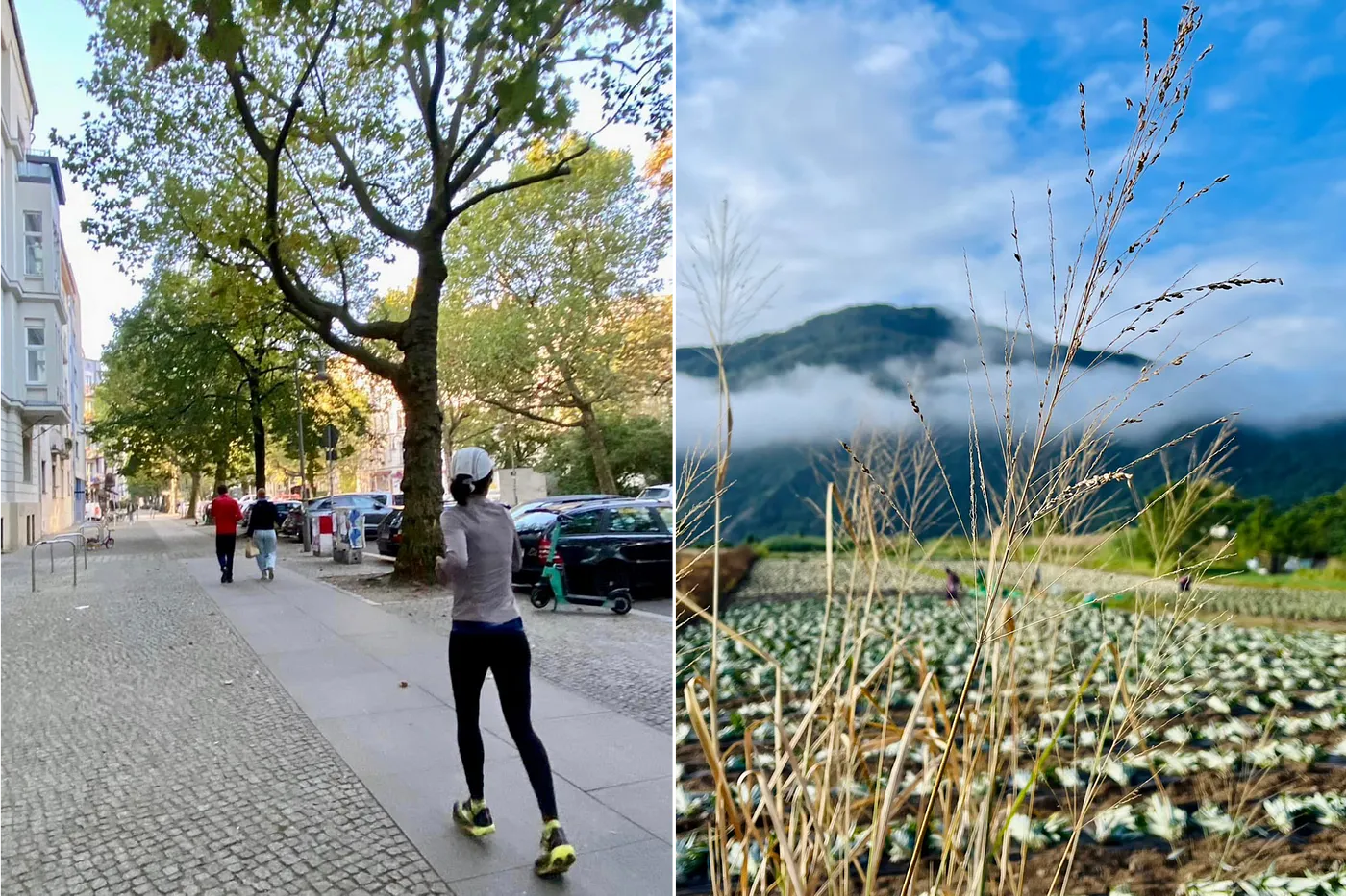 在柏林街上練跑的身影。(左圖攝影/孫維利)每日陪伴她的龍田景緻不停在變化。(右圖提供/Rachel)