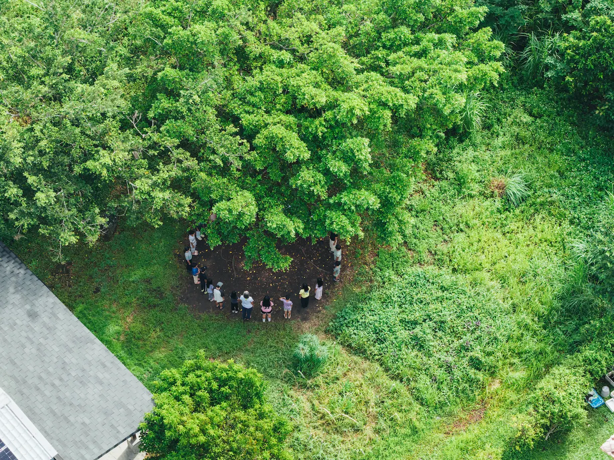 從港口部落活動中心旁的小路左轉,朝海的方向開,抵達Tamorak南瓜共學園的時候,草地的那一邊隱隱傳來孩子們的合唱聲。沿著鋪成河流形狀的碎石路,經過樓房地下室與客廳、鞦韆與新建的半露天鐵皮教室、平房教室和旁邊的洗手台,一路來到一棵大樹底下的大石旁,幾位老師跟一群孩子們正圍成一圈,在摻著碎光的樹影裡陸續舞動出魚兒游動、人們撒網、耕種和搗麻糬的動作;歌聲之後是晨詩:「O ‘edil no cidal,patangangl/patangad to hekal……(太陽的光芒照亮世界……)」以及一段擁抱自己四周力量的禱詞:「感謝在我之上/之前/之後的美麗......」晨圈結束在兩個孩子有些靦腆的阿美族語短講,然後孩子們分年級散開到不同教室,開始今天的學習。他們稍晚還會再會合,一起到河邊上河流課。