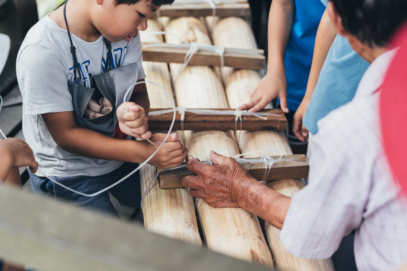 靜浦部落耆老帶孩子們認識小竹筏構造、練習繩結(攝影/李維尼)