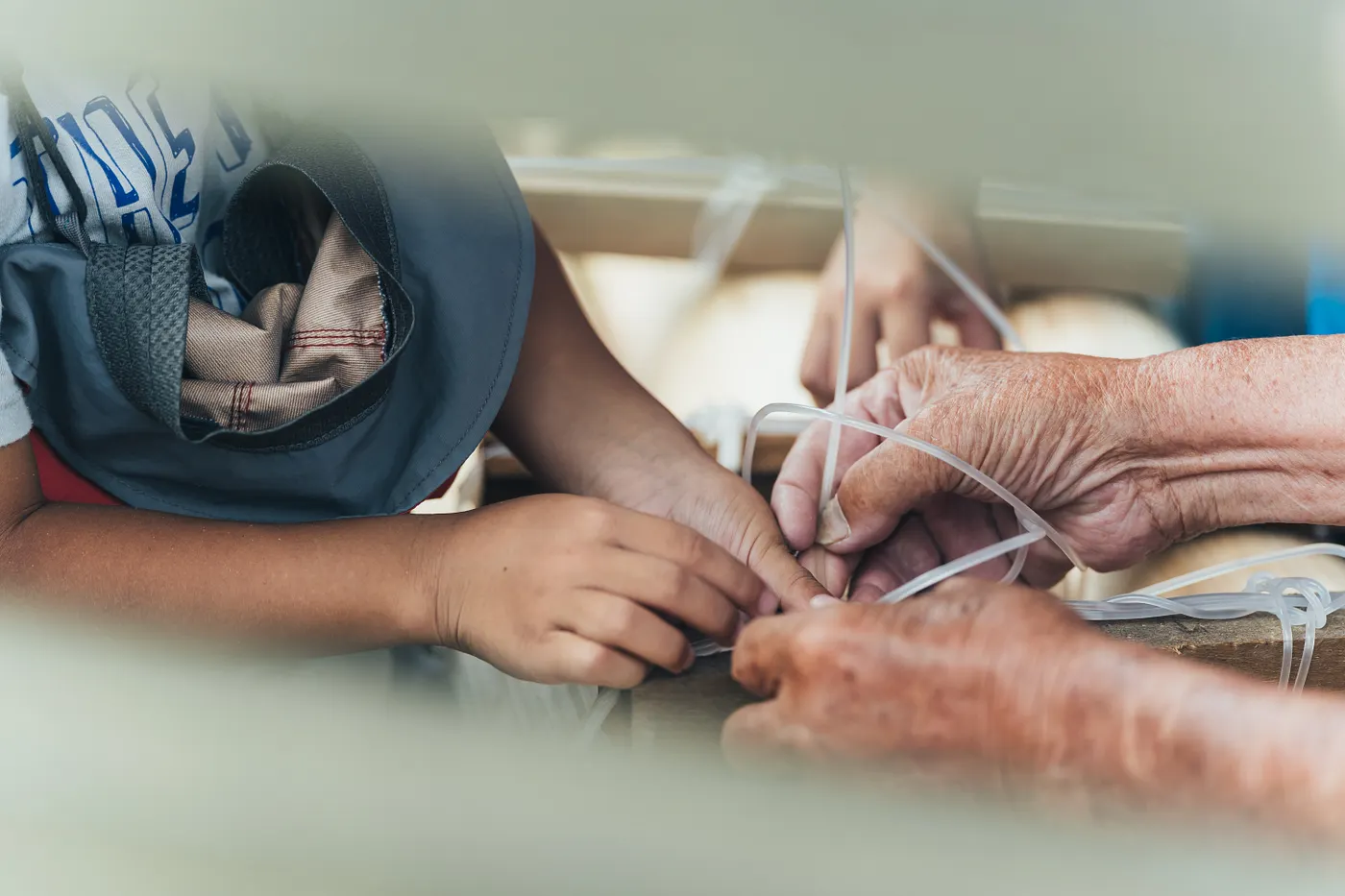 Maro 阿公教孩子們如何打固定tolo’ay的繩結,並讓他們練習(與玩耍)。國中部學生們則跟著Panay與Adirong兩位老師,散步走下緩坡,到秀姑巒溪旁的泛舟上岸處來觀察河流。在Tamorak任教已經六年多的Panay說,河流課每年都有,有時也會溯溪或去海灘。孩子們像在自家後花園走路那樣,玩鬧之中觀察著自己熟悉的景物。