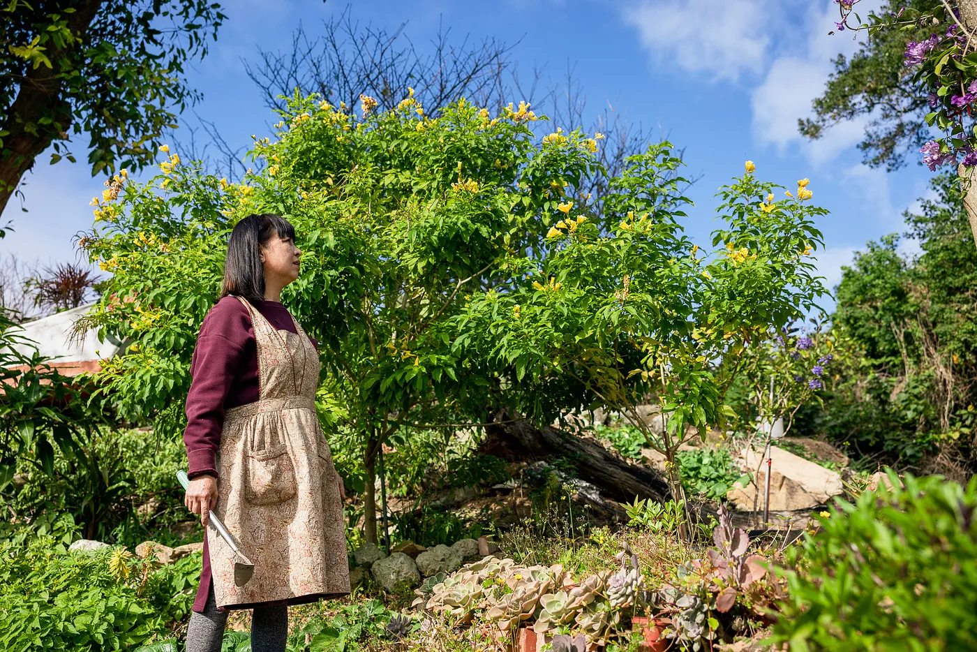 下了車,走往秀英家的途中,沿路盛放著一叢叢紫花酢漿草、一盆盆長壽花,都是秀英悉心整理的植栽,在她揮手向我們走來之前,「咪醬」已停駐園中小徑迎接我們。