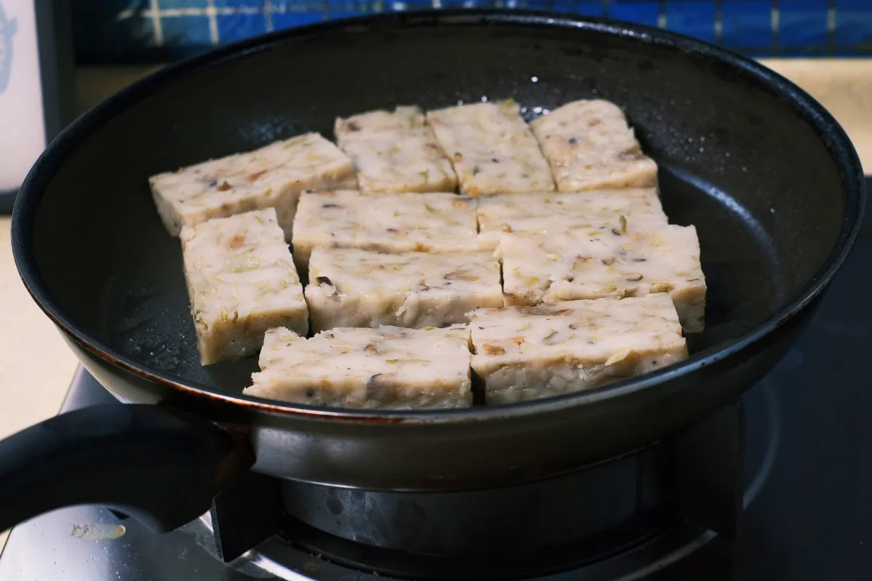園裏的艾草可以作艾粄,連佛手瓜也可以做成鹹甜粄:「你看我用香蔥、豬油做『配頭』,是不是就很客家味,我煎給你們吃。」客家人鹹甜粄裡,拌炒的餡料,多以紅蔥頭、香菇、三層肉,或蝦米為主。秀英還加了自家種的佛手瓜,更是爽脆清甜。