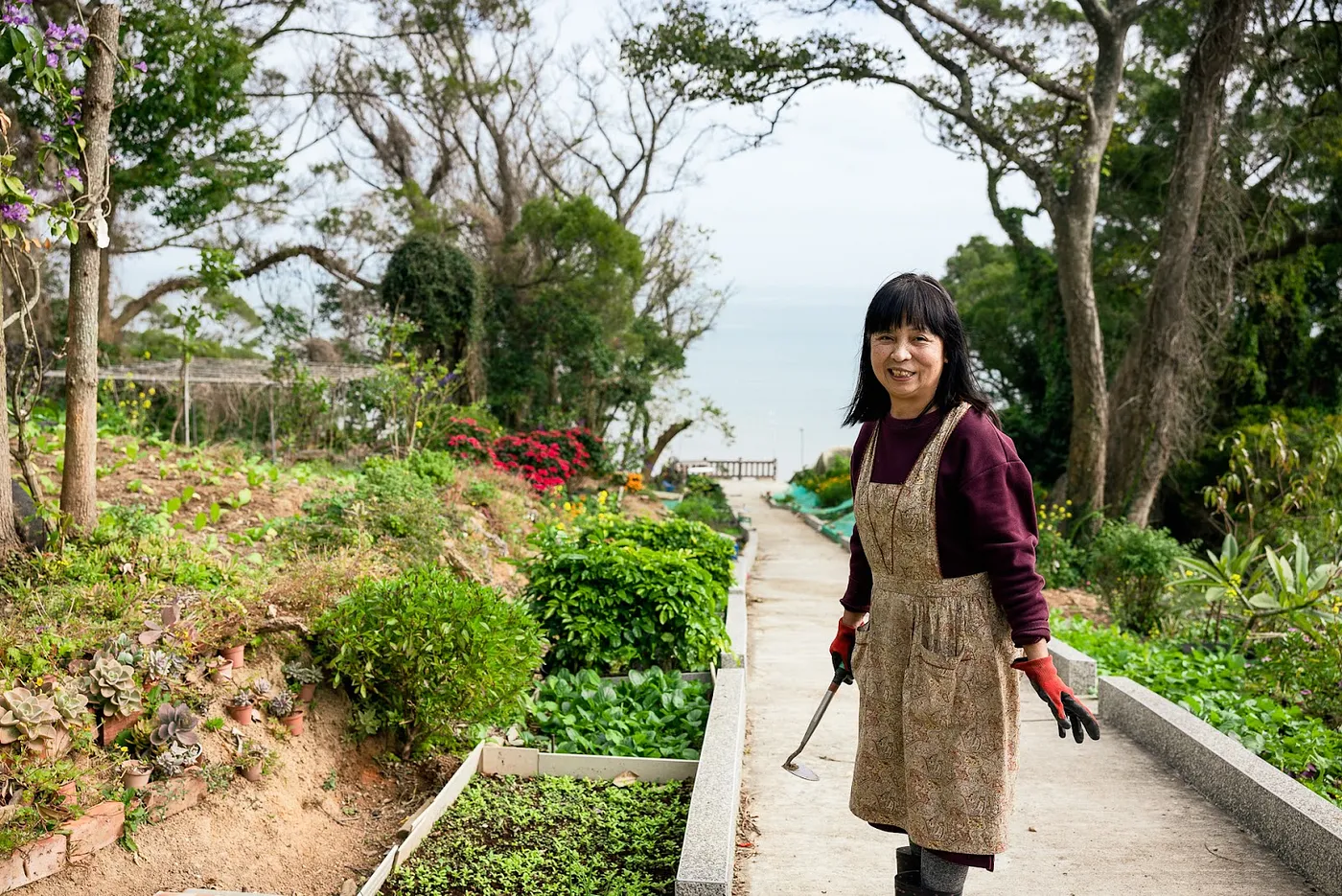 講到婆婆的離世,秀英不禁紅了眼眶。後來孩子長大,全家回到馬祖,起初是住在福澳,然而村中兩層樓的街屋,並不適合照顧孩子的他們居住。後來租約到期,他們決定改建老家,那時,老家旁的山坡地蔓草叢生。他們墾荒、建屋、再闢園、耕地,一家人在此,終於安居了下來。