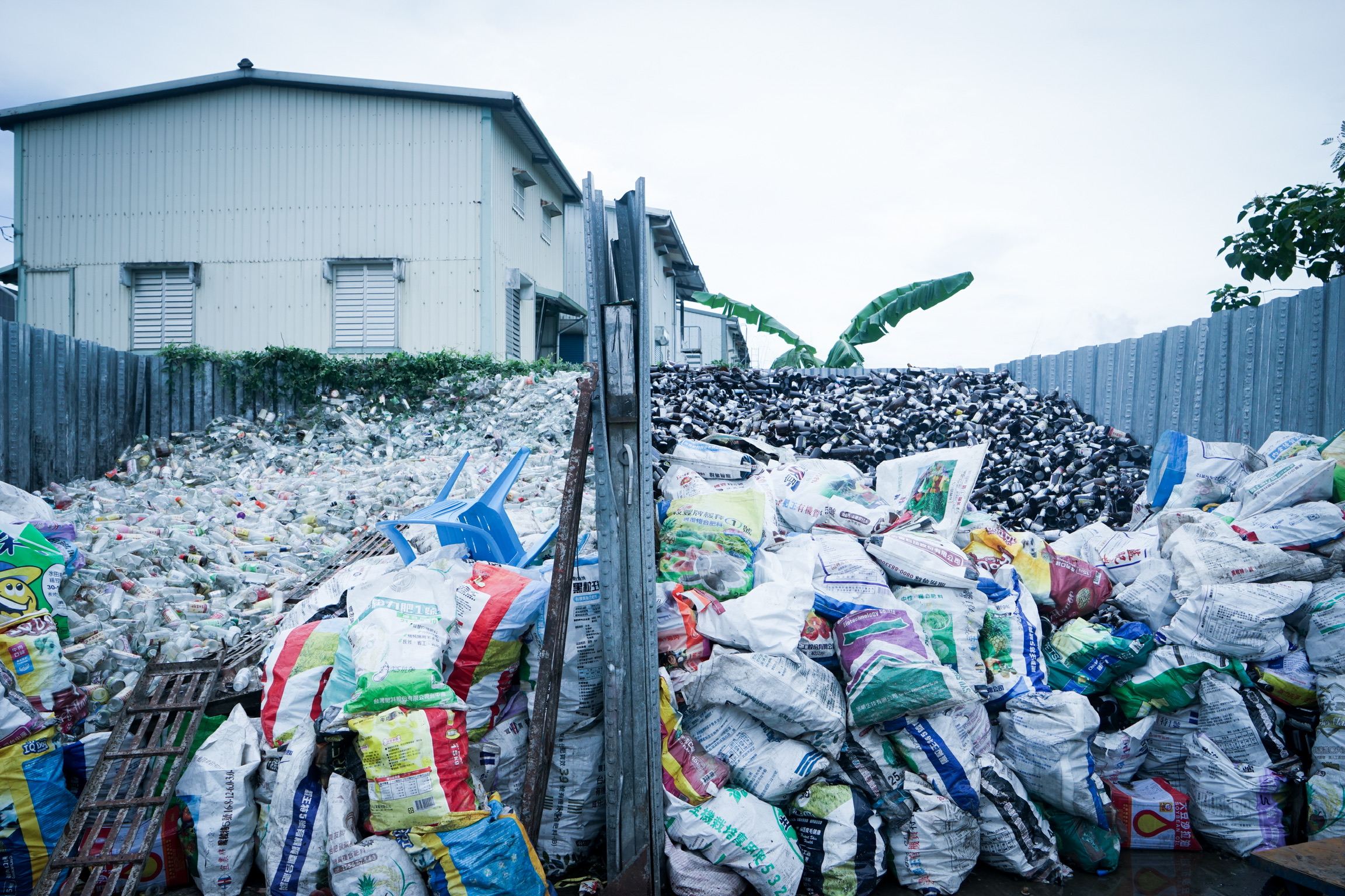 他帶我們來到資源回收場,白酒瓶、黑酒瓶分門別類,還有大型洗衣機、冰箱等電器需要拆分。(攝影/孫維利)