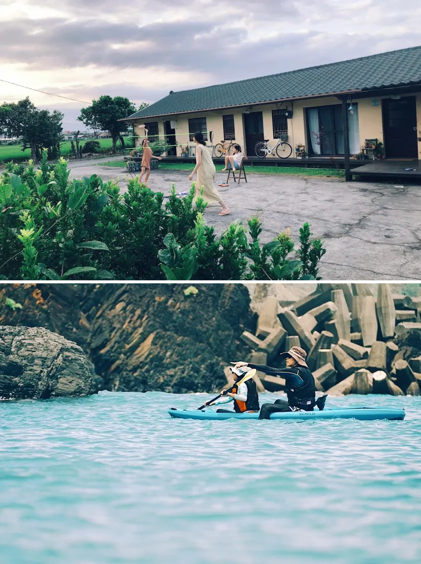 在冬山鵝黃色平房前有塊空地,客人可以帶孩子到此放電、小如也會跟女兒進行打羽球等運動。(上圖)搬到宜蘭後,他們全家會一起享受大自然活動,像是泛舟、衝浪、浮潛等。(下圖)(圖片提供/羊小如)