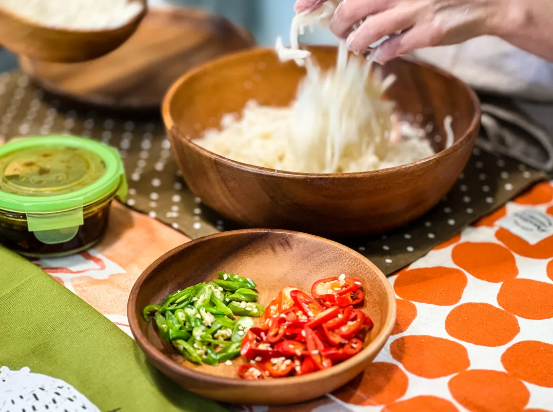 來到人家作客,洙竫先到廚房分享製作蘿蔔煎餅的,她熟練地以中筋麵粉撒入已經殺青好的白蘿蔔絲,並用手翻拌,「通常在製作這個步驟也會同時拌入辣椒粉,我之前在製作的時候一時分心,沒注意到手上沾滿了辣椒粉,居然就揉拭了自己的眼睛,那時真的辣翻了。」在做菜的時候需要顧及步驟,但也要專注手上的辣椒,不能鬆懈分心避免憾事發生。接著要把拌勻麵粉的蘿蔔絲捏形好,放入已經熱燙的油鍋中,以小火雙面慢煎,再將熟的蘿蔔煎餅壓上兩紅一綠的生辣椒片添色,即完成了這道菜。