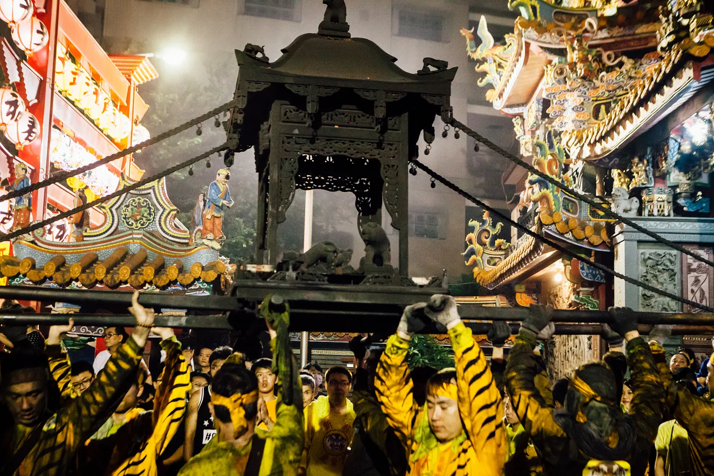 夜官巡境,循著「官將首」腳上鏗鏘的鈴鐺步伐,走到廟前老街石板路上,意味著,壓煞避凶的暗訪之路即將要結束了,地藏庵裡探頭伸長了脖子的男女老少,在神聖的鐘鼓擊聲裡,靜靜地等待著,從沈穩到急促聲落下,心裡不禁讚嘆著,勇將歸來了。