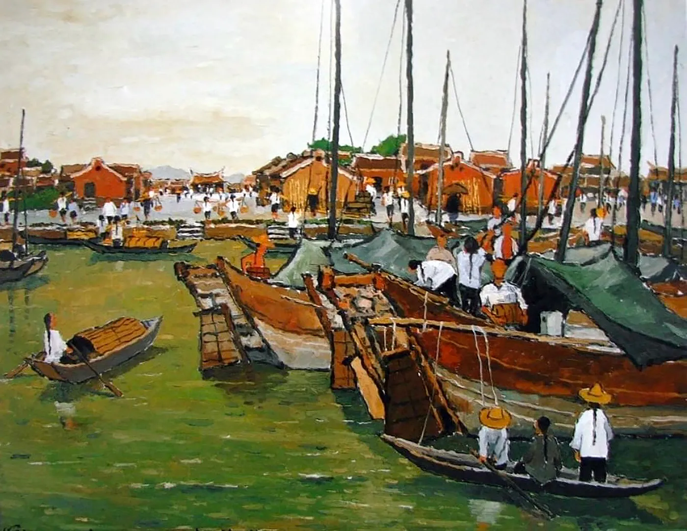 《十八世紀末的新莊港》簡文仁創作,想像繪畫出三百年前的新莊港,千帆林立,畫中遠處廟宇即為現今新莊媽祖廟「慈祐宮」前。圖片提供:簡文仁
