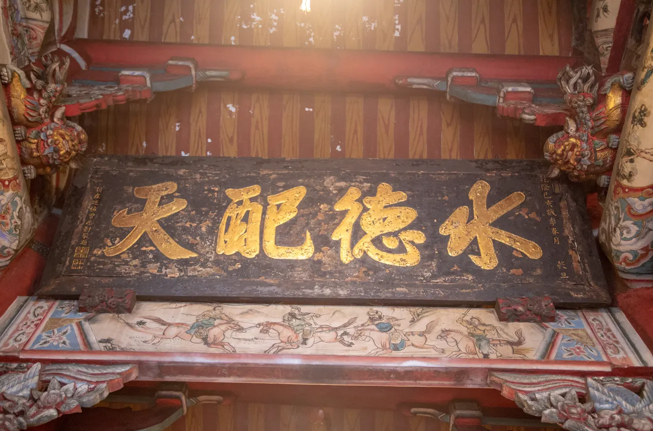 匾額「水德配天」是新莊慈祐宮目前收藏年代最久之匾額,於1777年(清乾隆四十二年)時任地方父母官新莊巡檢曾應蔚特別頒予此匾給廟方。創作者:慈祐宮。建檔單位:全國教師會。數位物件授權:CC BY-NC(姓名標示─非商業性)。發佈於《國家文化記憶庫》