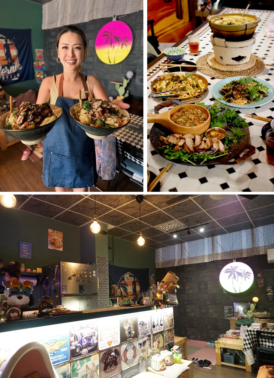 每次端出大份量的餐點,還會隨餐隨心情附贈一大缸的酒精。(左上圖提供/小美)在這間店有上百道菜的選擇,每一道都充滿味蕾新鮮度。她把舊空間打造出有點美式風格的隨性與自在。(攝影/孫維利)