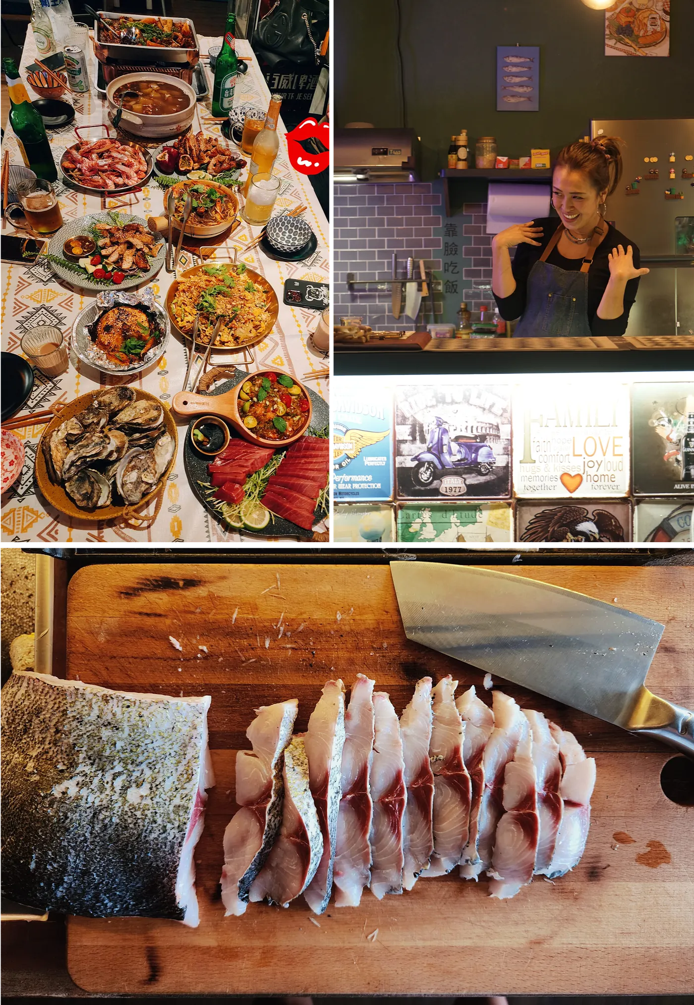 這裡養了一群熟客,各種佳餚、美酒和隨性聊,讓港口在地人與旅人在這裡找到歸屬。(左上圖片/小美)美美的小美天生有渾然天成的表演欲與搞笑基因,經常有出奇不意送上「美」式笑點。(右上攝影/孫維利)南方澳經常捕撈到鬼頭刀,是店內最愛用的魚種之一。(下方圖片/小美)