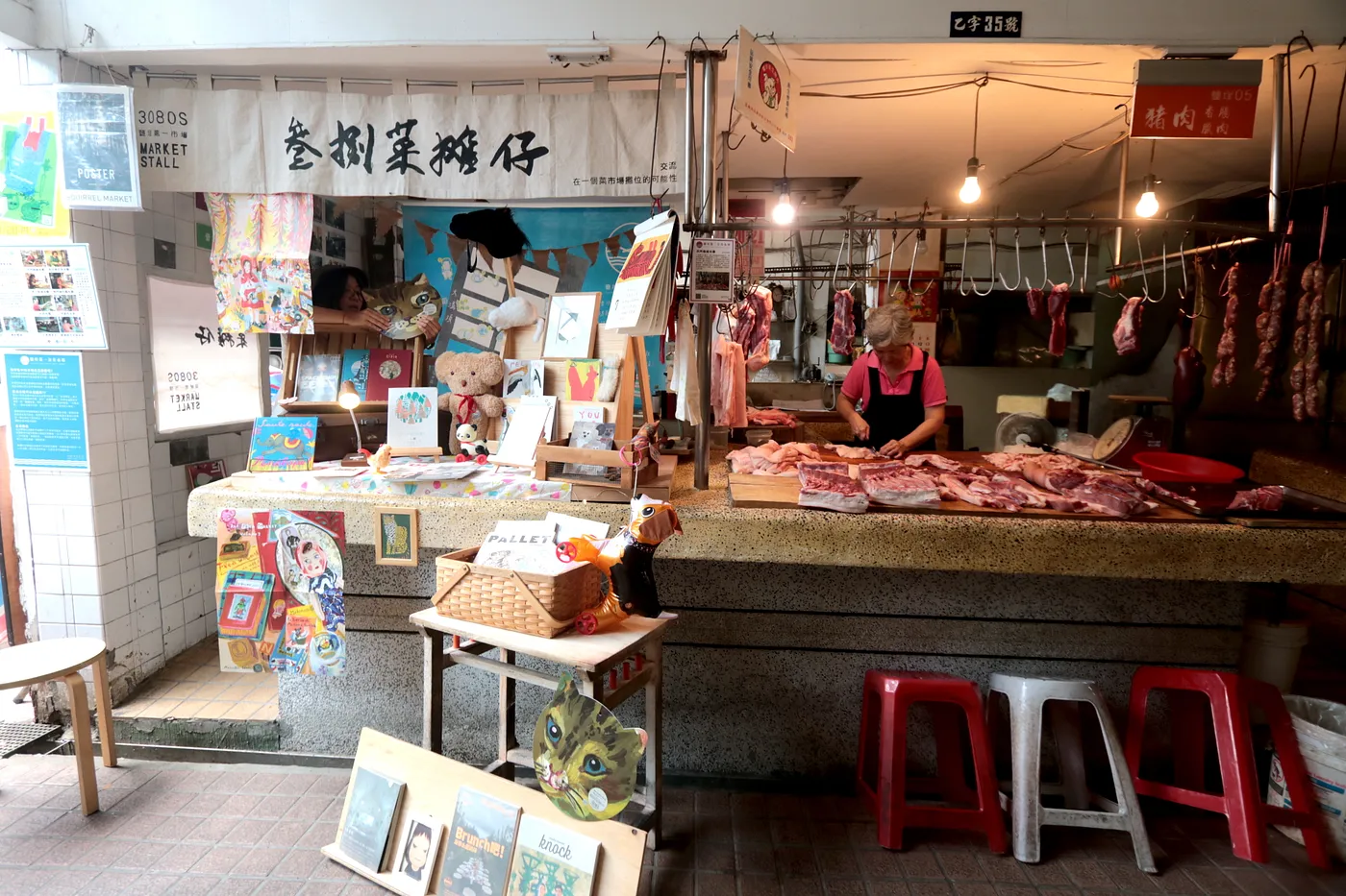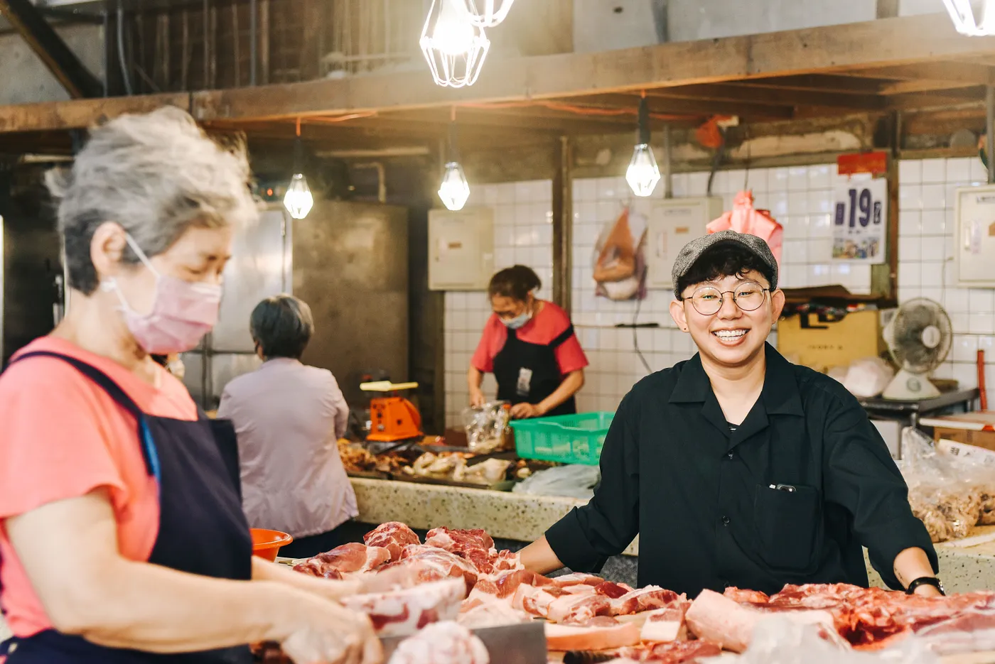 一邊聊著,豬肉攤洪阿姨也在一排排的豬肉堆中,跟我們解釋豬肉部位的區別與美味。文昕說笑說,以前管理叁捌菜攤,長輩們多少有些距離;但有次跟洪阿姨一起合作職人體驗「灌香腸」獲得好評迴響,其他攤主也紛紛表示願意分享教學,「週一本來就是洪阿姨做香腸的時候,我們選那天舉辦香腸體驗,大家可以帶走一斤香腸外、也要幫洪阿姨做完原本要做的份量。」透過這樣的學習互動,扭轉市場裡的女性看待自己的角度,「市場裡的女性謙虛、不張揚,甚至會對自己在市場裡的身份感到自卑,我們想要透過活動傳達:她們會的事情,對我們來說有多珍貴。」