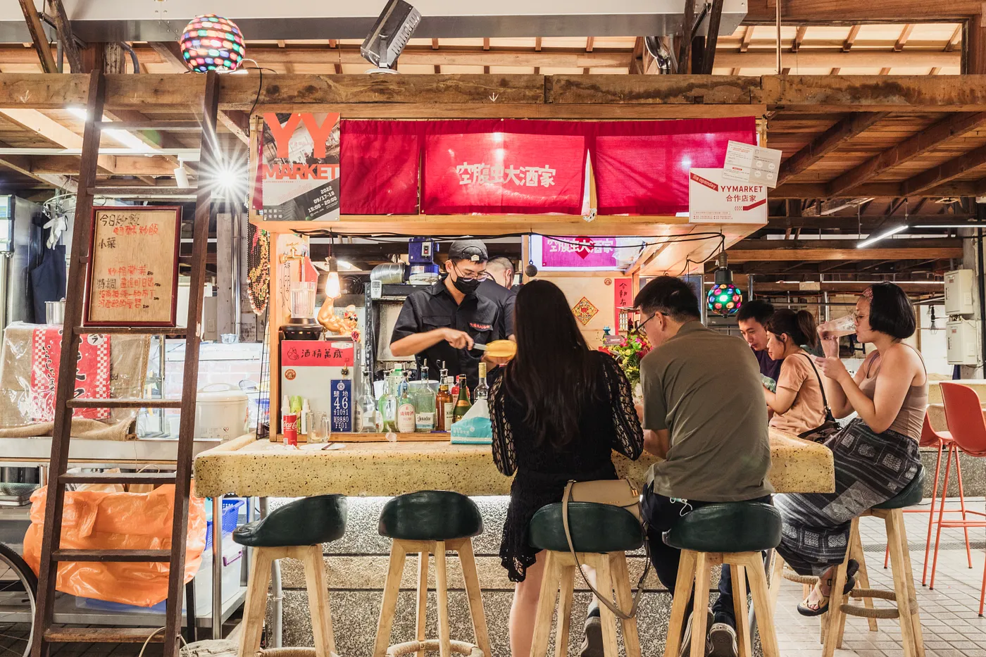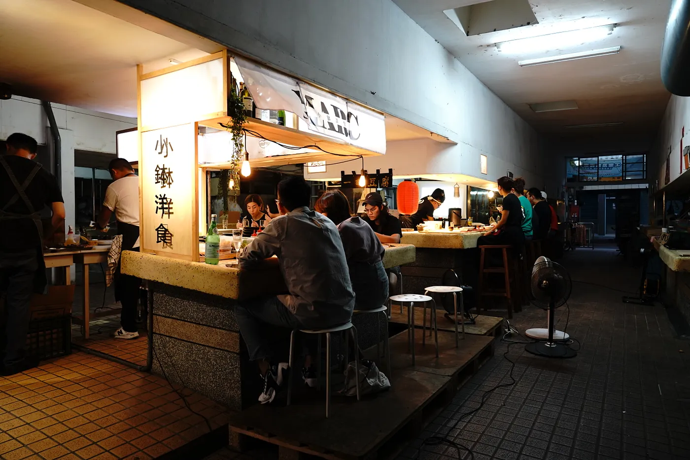 從前,人人蜂擁進到鹽埕裡創業,而鹽一市場卻是給低收入戶養家活口、低價承租攤位使用,環境並非友善、更別說會有年輕人想在此創業,「青銀共市的念頭出現,長輩、年輕人共同在市場經營,而是透過青年在這裡營運,帶來人流、創造話題。」於是,她們邀請了長期合作的建築師夥伴「一起設計」,用少少的成本完成七座攤位設計,並邀約有趣的料理人來做示範,有了「尋味夜間部」和「埕市快閃」企劃。她說,因為自己喜歡深夜食堂,書裡每個故事都獨立成篇,主角是來店裡用餐的客人,「而這深夜食堂版的『尋味夜間部』,每次也會邀約不同攤位料理人為主角,一天只接16到32位客人,透過料理、陳述他們的人生故事。」她舉例,找來拍謝少年樂團主唱梁薑薑和設計師廖小子聯手推出「下酒菜之夜」,薑薑創立餐酒實驗品牌「配配酒」,小子結合日本釀造工藝與進行酒標設計的品牌「釀了你Guzzle」,酒餚相伴,就算在在昏暗又炎熱的天氣裡,依舊有許多人潮蜂擁,「只要你企劃夠有趣、夠好玩,你也可以在這市場有月收數上萬元的收入。」